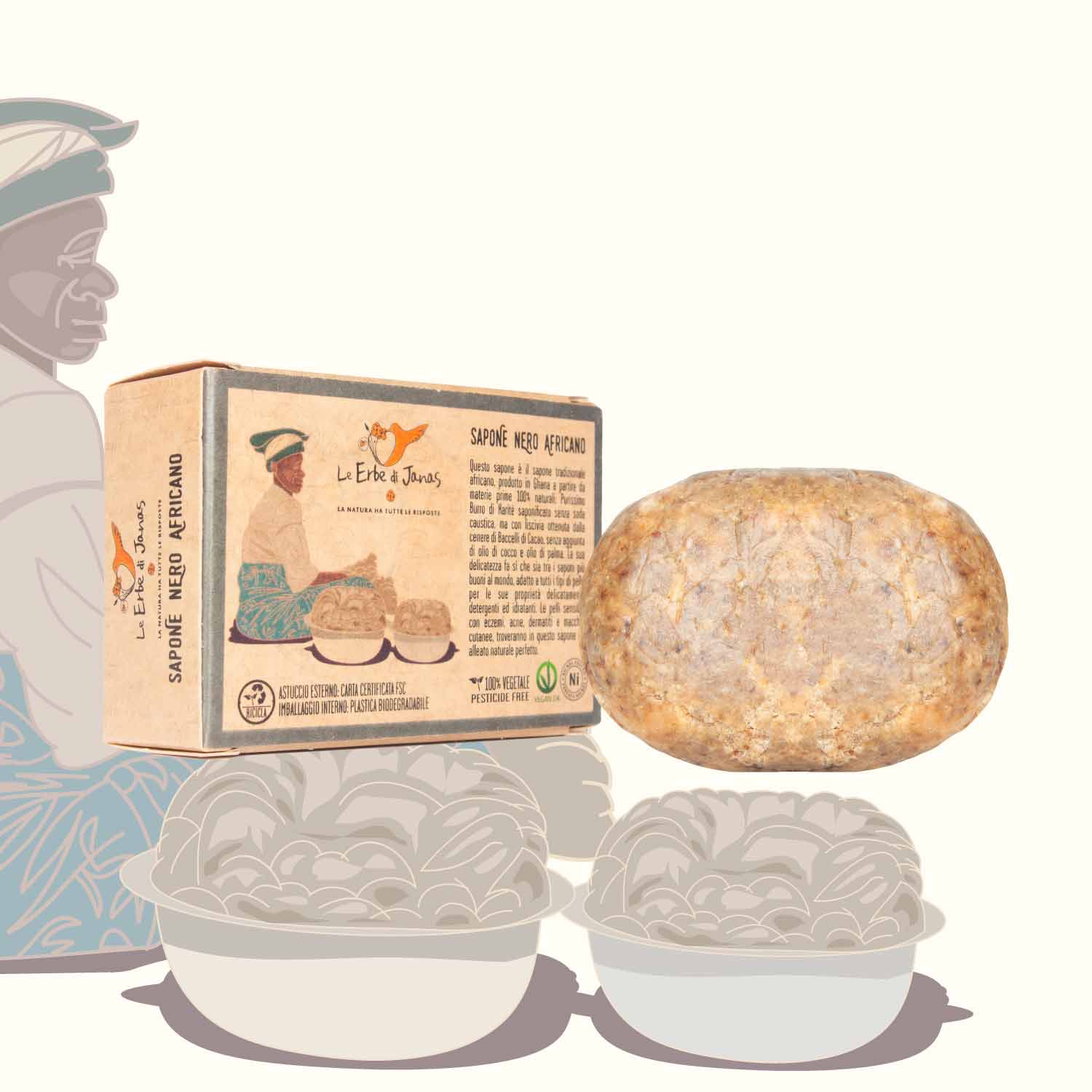 Questo sapone è il sapone tradizionale africano, prodotto in Ghana a partire da materie prime 100% naturali: purissimo Burro di Karitè saponificato senza soda caustica, ma con liscivia ottenuta dalla cenere di Baccelli di Cacao, senza aggiunta di olio di cocco e olio di palma.